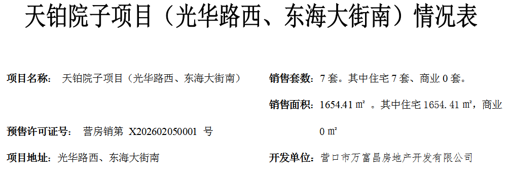 根据《中华人民共和国城市房地产管理法》《城市商品房预售管理办法》有关规定,我局对营口市万富昌房地产开发有限公司开发的天铂院子项目(光华路西、东海大街南)营口市老边区民兴河路东21-2、营口市老边区民兴河路东19-4商品房预售条件进行审查,经审查合格,现颁发商品房预售许可证,并依法公告,详见附件。